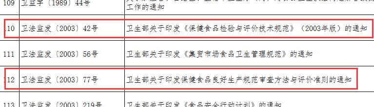 此次被宣布失效的两部涉及保健食品的重要文件分别为《卫生部关于印发<保健食品检验与评价技术规范> ( 2003年版 ) 的通知》及《卫生部关于印发保健食品良好生产规范审查方法与评价准则的通知》。