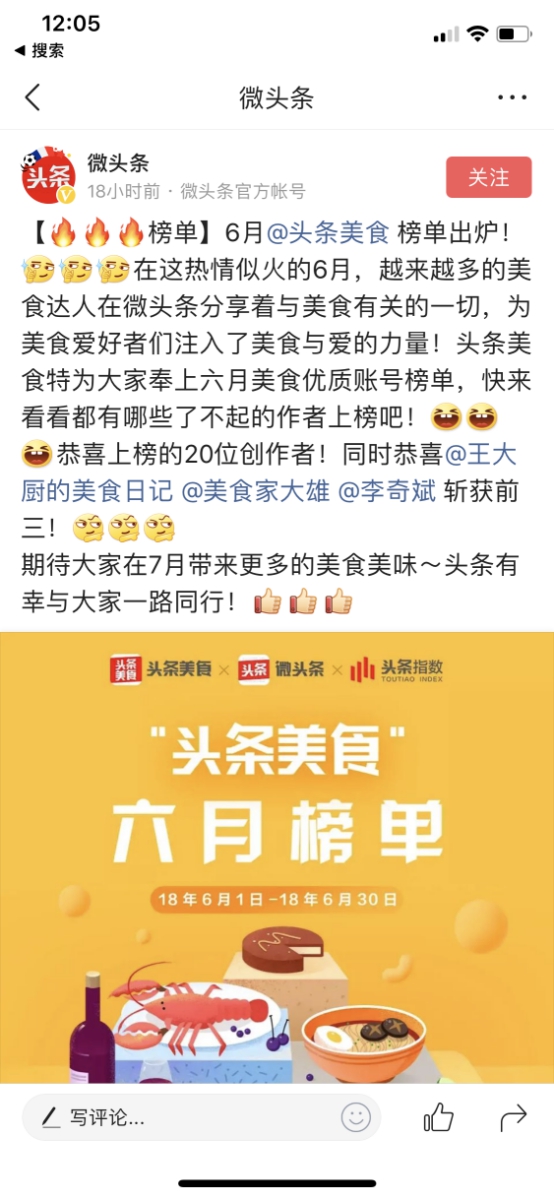 今日头条是拥有1.2亿日活用户的新闻客户端,美食频道内容丰富,流量很大。此次发布的6月的榜单上,有诸多知名美食自媒体。