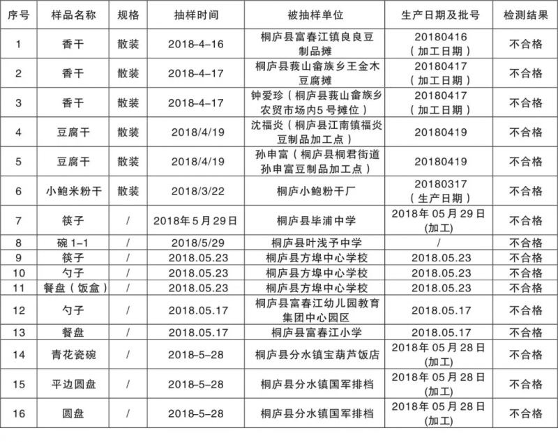 据桐庐县市场监管局相关负责人介绍,此次检查,执法人员在流通环节共抽检了食用农产品、卤味共计52批次,抽检项目均合格。生产环节重点抽检了具有当地特色的粮食加工品、肉制品、方便食品、酒类、蛋制品、豆制品、蜂产品等7大类,共68批次,其中有6批次抽检项目不合格。目前,曝光问题最多的集中在餐饮环节 ,抽检了食用农产品、煎炸油、米面制品等52批次,餐饮具88批次,其中有10批次餐饮具抽检项目不合格。