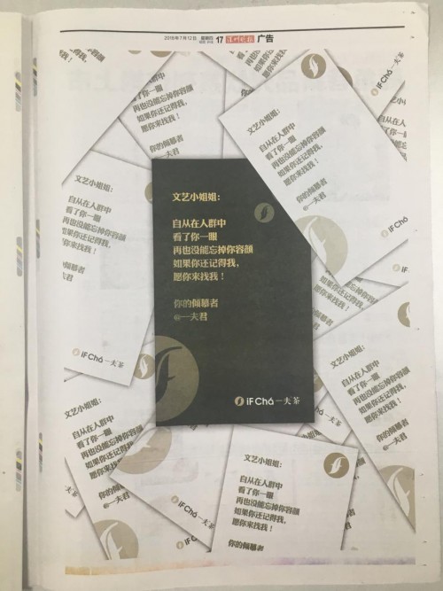 原来,这是一夫茶发起的一场创意广告,以“求爱信”的形式,让网友们在联想中产生美好的感受,亦如一夫茶带给消费者的体验一般。