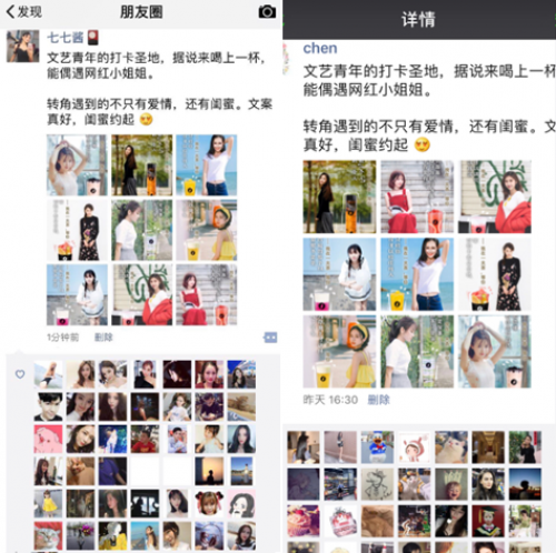 近日,配合相关文案,一夫茶发布了九位网红小姐姐的海报,被网友转发至朋友圈,刚好形成了一个由网红小姐姐组成的“九宫格”,自此,一场网红小姐姐与网红饮品的美丽邂逅也正式登场。