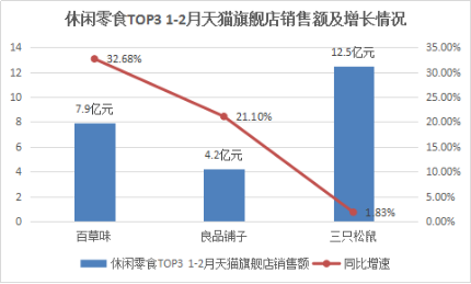 而据公开数据显示,2018年Q1期间,随着年货节的热卖,为2018年休闲零食行业发展迎来了开门红,据天猫旗舰店1-2月的销售数据显示,三只松鼠旗天猫舰店销售额达12.5 亿,同比增长1.83%,良品铺子1-2 月份销售额为4.2 亿元,同比增长21.10%。其中,百草味1-2 月份销售额7.9 亿元,以同比增长32.68%的增幅领涨整个休闲零食行业。