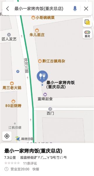 昨日上午,记者来到公告中提到的江北区“最小一家餐饮店”现场打探。这家店在网上地图注册的名字是“最小一家烤肉饭(重庆总店)”,地址在江北区洋河三路(洋河二村3号附17号)。