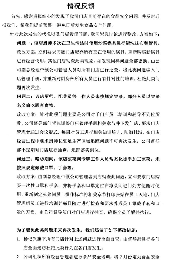 针对杨记兴臭鳜鱼合生汇店存在的食品安全隐患情况,记者曾致电该公司沟通未果。6月29日,经过多次联系,记者终于采访到杨记兴公司负责人时先生。他表示,感谢媒体发现公司门店存在的食品安全问题,针对此次发生的食品安全问题及门店管理问题,公司经紧急讨论并做出了整改计划,“具体实施需要些时间。”值得注意的是,在时先生提供给媒体的这份书面“情况反馈”整改计划上,没有出现名称、公章、时间等重要信息。杨记兴公司对食品安全问题的态度由此可见。