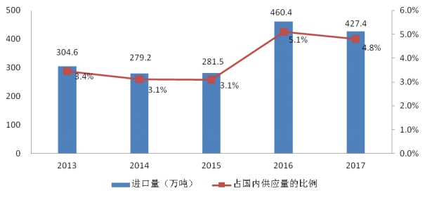 2013-2017年我国肉类进口量和占国内供应量的比例