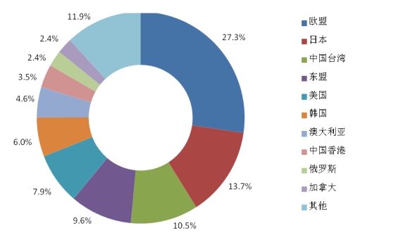 近年来,我国进口食品贸易的特点是:数量快速增长、来源更加广泛、品种覆盖齐全、进境口岸相对集中,部分进口食品已成为国内市场重要的供应来源。2017年,我国从187个国家(地区)进口食品,其中进口食品贸易额列前10位的分别为:欧盟、美国、新西兰、印尼、加拿大、澳大利亚、巴西、马来西亚、俄罗斯和越南,共440.3亿美元,占我国进口食品贸易总额的75.5%。