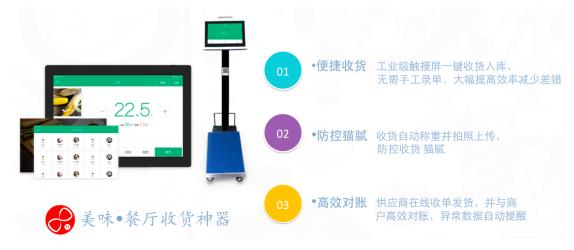 这双“眼睛”可在收货时自动拍照,自动留存原始称重读数(未来还会加入人脸识别,食材图像识别与理解等AI技术,)同时它还支持“千里眼”功能,即使老板或厨师长不在现场,也能事后通过手机实时了解收货现场状况,大幅提升了收货环节的透明度;“大脑”可以自动同步订货单,无需手工记录纸单再手工录入系统,触摸屏一键完成入库,省去手写收货单效率低、容易出错、跟供应商对单的麻烦,让验货入库同步完成,大幅提升收货入库效率,大大提高数据的准确性和安全性。