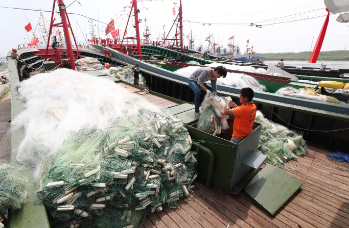 7月24日,渔民在江苏省连云港市赣榆区青口港渔业码头将渔具装船,为出海开捕做准备。