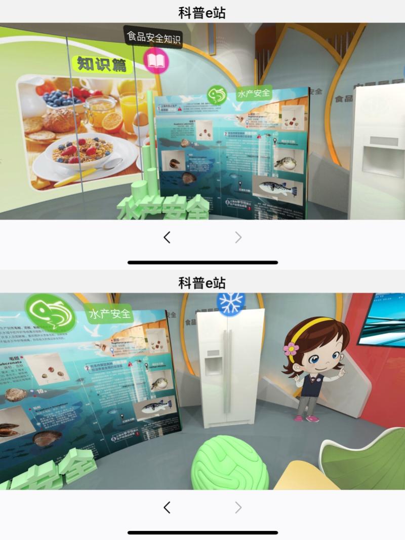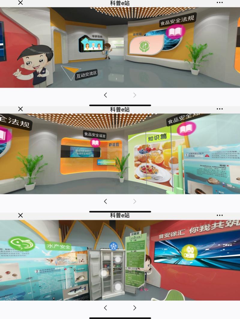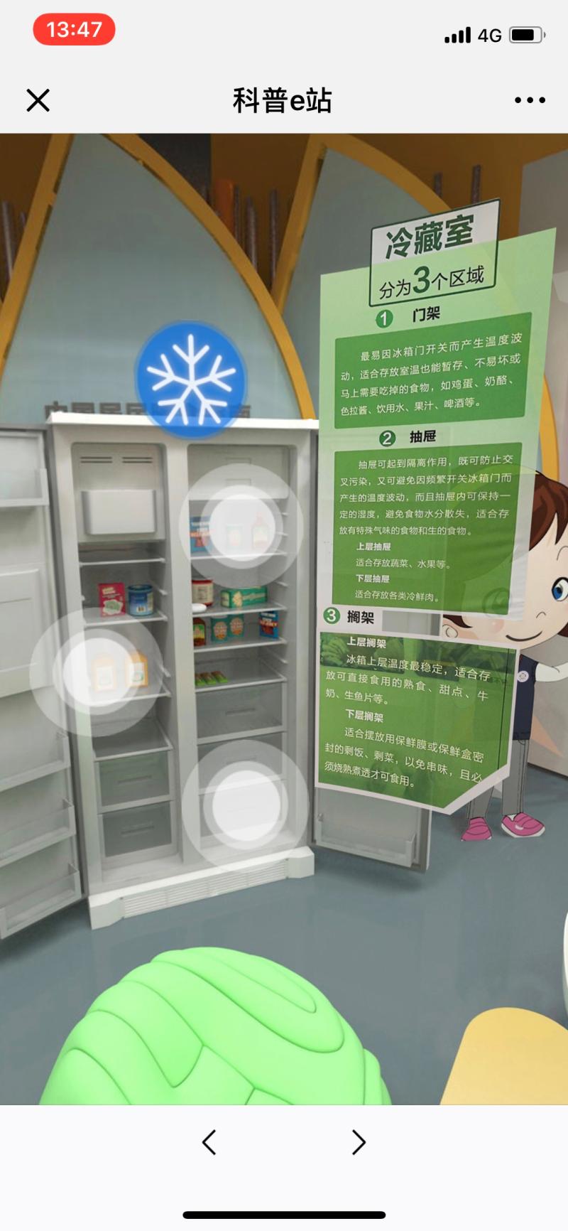 打开“徐汇市场监管”微信公众号,依次点击“信息发布”、“科普e站”,一个360度的沉浸式虚拟展示厅就呈现在屏幕中。线上科普站主要分为科普大厅和互动交流两大功能。其中,科普大厅包含法规篇、辟谣篇、知识篇,分别介绍食品安全重点法规、食品安全热点辟谣和各类食品安全常识。此外,大厅中还有一台虚拟冰箱,点击上方的雪花状标识,就能了解冷冻室和冷藏室的门架、抽屉、搁架上分别适合放置的食品。