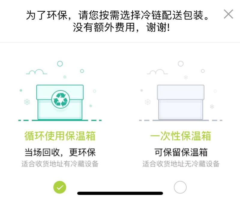 不过,细心的陈小姐发现,这家电商平台除了一次性包装外,也提供可供回收使用的环保包装:“我在其他电商买东西时看到过那种箱子,就是送货员把需要冷藏冷冻的商品放在里面,取出商品交给消费者后,将箱子带回去。这种形式挺好的,只是需要消费者在家等着。所以我在有条件的时候都会选这种包装。”