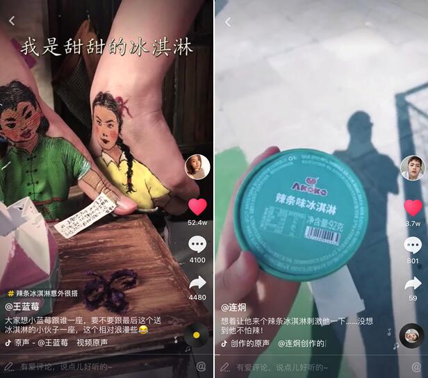 时下,抖音上的花式营销玩法带火了一大波口碑好物。AKOKO将辣条与冰淇淋的脑洞搭配,创造出来史上首款辣条味冰淇淋。自带话题性口味和绝佳的口碑让它成为了众多抖音达人脑洞大开的灵感来源,吃过AKOKO辣条冰淇淋的吃货惊艳地发现:AKOKO辣条味冰淇淋,巧妙地将辣条的咸香与冰淇淋的软糯冰凉完美融合,同时和火锅、麻辣小龙虾等各种食物搭配来吃,体验更加独特而奇妙。 因此,AKOKO顺势在抖音上发起的“辣条冰淇淋意外很搭”的话题,引发了大批抖音用户的共鸣,纷纷贡献出各种趣妙横生的脑洞搭配吃法,其中《妈,他说我像辣条是不是因为我黑》创意短视频更是引爆人气,在抖音发布仅一周便收获近1200万播放量,点赞与互动更超过50万人次。