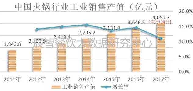 近几年来,火锅行业发展迅速,年增长率均在10%以上,虽然2016年整体增长趋势略有下降,但火锅行业的营业额达到整个餐饮行业总营业额的22%。