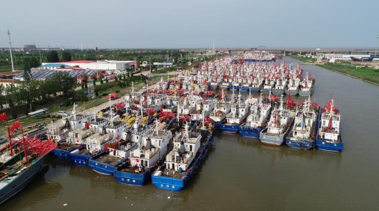 2018年7月31日,在江苏省连云港市赣榆区青口港渔业码头,渔船在港内等候出海作业。