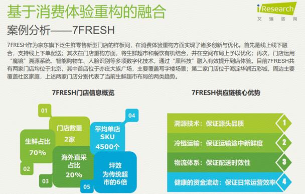 以京东7FRESH为例,2018年初京东入局线下生鲜领域,接连开出7FRESH亦庄大族广场店和清河五彩城两家门店,分别针对了办公区和住宅区的不同群体,通过线上线下同款同价的模式,为消费者提供“人到店”和“货到人”的多场景消费覆盖,满足了消费者对于生鲜商品即食需求的要求。