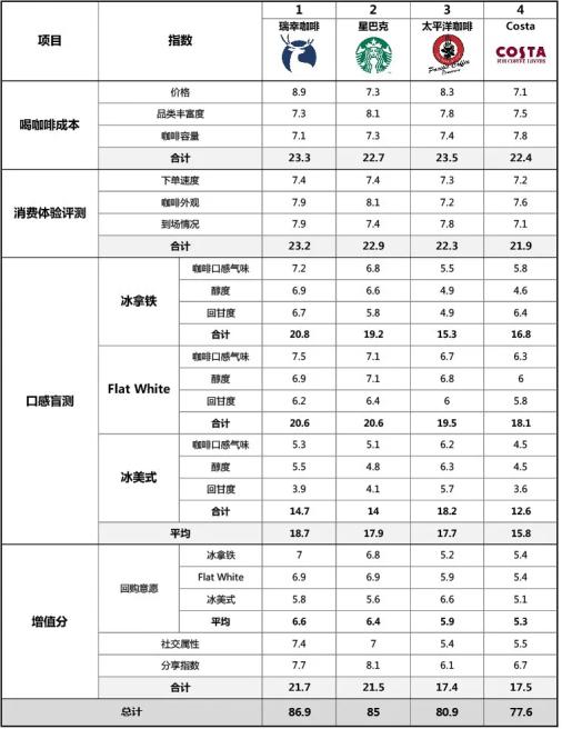 为了保证公开公平,整个评测过程采用盲测的方式,分别从喝咖啡成本指数、消费体验评测、口感盲测、增值分四个维度进行测评。在每一个方面,咖啡达人们都从不同角度进行了亲身体验。比如在喝咖啡成本指数对比上,分别考量到了品类丰富度、价格、容量等指标,而在消费体验方面,则着重考量了下单速度、产品外观、到场情况等。