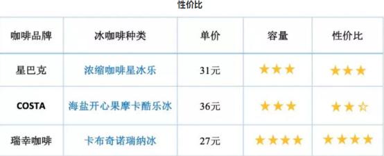 无独有偶,金羊网所做的测评同样极具针对性。针对夏日最热卖的冰咖啡这一品类,测评人员同时购买了星巴克、costa及瑞幸咖啡三大品牌的夏日冰饮:浓缩咖啡星冰乐、海盐开心果摩卡酷乐冰、卡布奇诺瑞纳冰。所选测试杯型均选择了最便宜的杯型,以此达到测评的公平性。