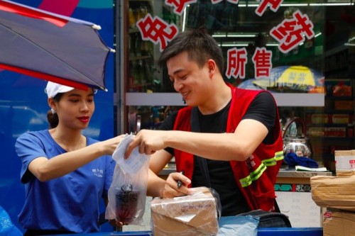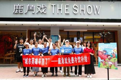活动进行了一个多小时以后,鹿角戏门店前的高温作业者越来越多,当员工开始忙到“满头大汗”时,一位围观的路人主动上前询问需不需要帮忙,他可以做志愿者。鹿角戏的员工表示:“当时真的很感动,瞬间就感受到善意在传递!”