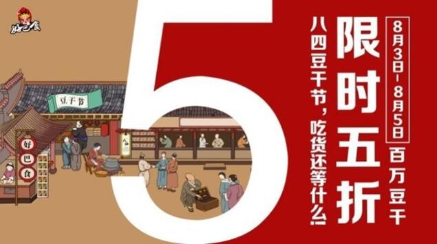好巴食豆腐干作为豆制品行业中的领先品牌,首创“84”豆干节。豆干节区别于以往传统卖场促销,抢购等活动形式。恰逢徽记食品17周年庆,豆干将5折回馈百万消费者,8.4日全国狂欢。一年就等这一天,错过了就要等明年了,好巴食豆干疯狂折扣,限时5折。
