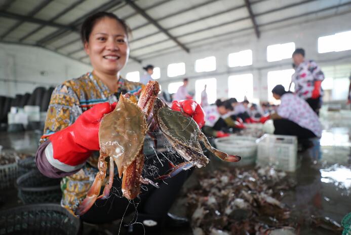 8月6日,渔民在连云港市赣榆海头港海产品交易市场分拣梭子蟹,准备装车外运。