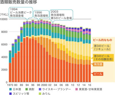 导致啤酒销量下降的最初契机是1994年“发泡酒”的出现。日本Suntory(三得利)公司利用酒税法中“麦芽含量在67%以上”的为啤酒这一规定,开发出了酒税要比啤酒少的、含麦芽量更少的“类似啤酒的”商品。味道和口感都和啤酒很像,但是却比啤酒更便宜,这种产品很快就得到了消费者的普遍认可。之后,其他厂家也纷纷推出了类似商品。