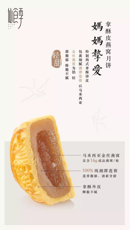 最操劳、最美丽的人儿,愿你被时光温柔以待。仙食季优选马来西亚5A级金丝燕盏,精炖后加入月饼中,匠心烤制拿酥皮燕窝月饼,香酥饼皮包裹着满满的Q弹燕窝,轻轻一咬,滑弹甘润,清香爽口,瞬间俘获她的芳心。