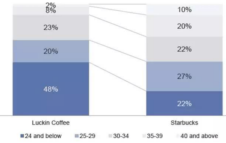 1,占领了年轻人市场:瑞幸咖啡在24岁以下的消费者占据了用户总体的48%,而星巴克相比之下仅有22%。34岁以下用户,瑞幸占比达90%,而星巴克为70%左右。用户越年轻,接受新生事物的意愿越高,社交化传播的意愿越强,更简单的说:拥有了年轻人,就拥有了未来。