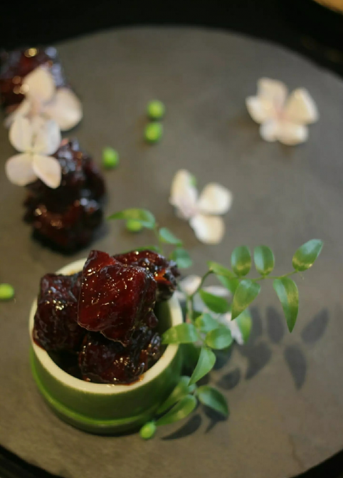 在桂语山房的菜品里,既能体会到孔子所谓“食不厌精,脍不厌细”的精致讲究,又有颜回“饭疏食,饮水”的安贫乐道。每一道菜都是一阕词。一块石板,几瓣落花,画成一碟“青石板话梅小排”。肋骨边上的肉质烹制得当,又紧实又松软;梅子酸甜适中,解腻消暑,正适合食欲不振的夏天。