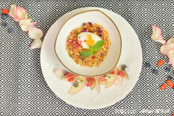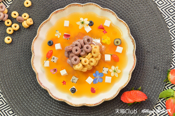 第一道早餐名为“天府之国”(Heavenly Land of Plenty),创意灵感来自于家乐氏谷兰诺拉系列的缤纷原料和成都“天府之国”的美誉,用“谷兰诺拉”系列为主食材,融入成都特色的鲜花和水果,营造水果和花的海洋,最后将多彩珍珠点缀在“谷兰诺拉”多彩花园之上,“天府之国“的景象跃然餐桌,犹如一幅晨间画卷。