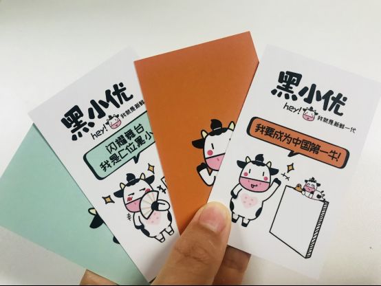“我是黑而优的黑小优,生产鲜而优的好牛奶。”“我要做中国第一牛!”“闪耀舞台,我是C位黑小优。”透过名片上幽默亲和的语言,搭配“hey!我是新鲜一代”的介绍,使新希望乳业的品牌主张快速抵达消费者的心智。