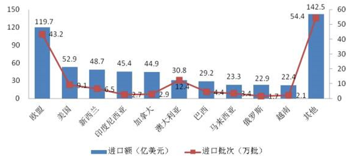 据统计,2017年,全国共进口食品142.9万批、5348.1万吨、582.8亿美元,同比分别增长7.9%、36.5%和25.0%。我国进口食品贸易额列前10位的食品种类分别为:肉类、油脂及油料类、乳制品类、水产及制品类、粮谷及制品类、酒类、糖类、饮料类、干坚果类和糕点饼干类,共539.1亿美元,占我国进口食品贸易总额的92.5%。