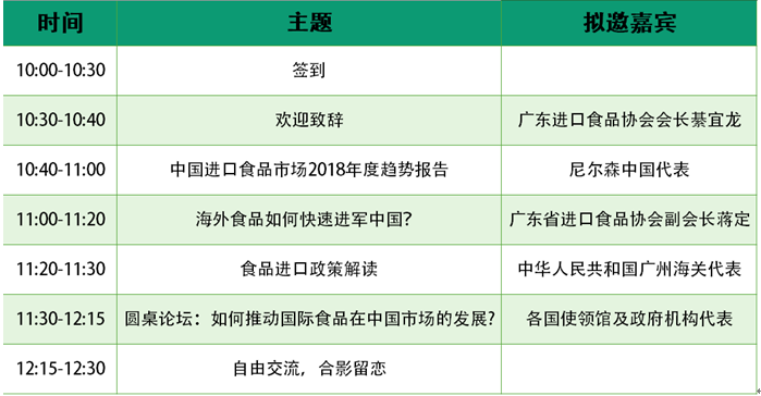 两天的进口食品发展论坛将定向邀请超过30位各国驻穗领馆代表、行业领袖参与演讲分享,吸引超过1000名进口食品行业决策者齐聚现场,深入探讨行业发展趋势、政策方针、流通渠道等多个行业热点,助力海外食品更好进入中国市场。
