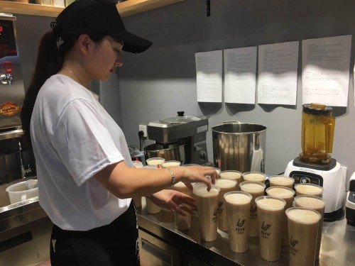 一边是大店内的座无虚席,一边则是小店前的长队,在一间不足10平米的1314茶店内,只是“象征性地”设了一个长形吧台,两三把高脚凳排列在吧台前,像是在说:“如果实在不方便带走,那在店内喝也行。”这是一家典型的档口店,但仍旧无需担心坪效的问题,因为在这样的店内,顾客外带,以及外卖才是收入的主要来源。