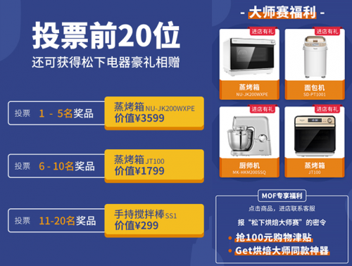 松下电器自创立100年以来始终秉持“贴近顾客的生活,帮助顾客实现更加美好的生活”的理念,与烘焙所提倡的热爱生活,享受生活概念不谋而合。而松下作为本次大赛的独家总冠名,为爱好美食烘焙的朋友带来了专属大礼。大赛举办期间,在豆果美食站内专题页中点击松下商品,联系客服,报“松下烘焙大师赛”的密令,即可得100元购物津贴;投票前20位的达人还可获得松下电器豪礼相赠。