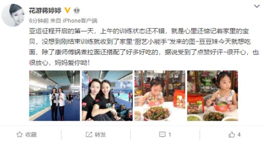 蒋婷婷在刚刚发布的微博中提到:“亚运征程开启的第一天,上午的训练状态还不错,就是心里还惦记着家里的宝贝” 但是老公在家给孩子做了康师傅锅煮拉面还搭配了好多好吃的,把孩子照顾得很好。这一内容足以显出她非常开心和惊喜的心情。毕竟来到亚运会,她最担心的就是孩子这一阵子会吃不好,但没想到单独照顾孩子的老公陈奇展现一手好厨艺。有网友打趣地说,现在来看,蒋文文的老公有压力了。