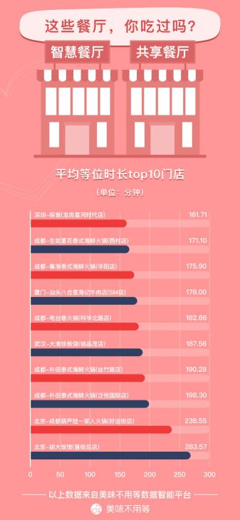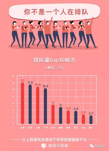 排队量前十名的城市中,除了北上广深这些一线城市,杭州,成都,武汉、长沙等热门美食旅游城市均有上榜。微博、抖音上经常能看到这些城市的网红餐厅推荐,热门城市好吃的多,同样排队的人也多。