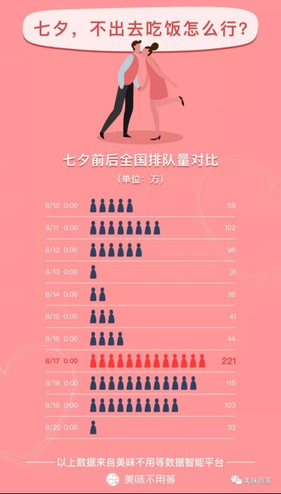 对比七夕前后,餐厅排队取号量在七夕这天明显出现一个高峰值达到了220多万。这一天情侣们外出吃饭,单身狗们也不甘寂寞,不管什么节日,用美食犒劳自己总没错。