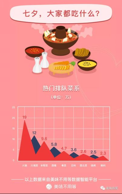 七夕,各大菜系中火锅牢牢占据着排队量榜首,川菜也紧随其后,看来大众还是普遍偏爱“重口味”美食,就连在七夕需要保持妆面精致和清新香气的小仙女们也忍不住拜倒在火锅的美味诱惑之下。