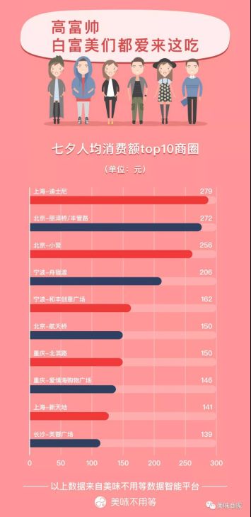 从数据来看,排队量前十的商圈基本都位于城市中心地带,这里多是大型购物商场娱乐消费十分方便,用餐之后购物看电影多是情侣间的不二选择。