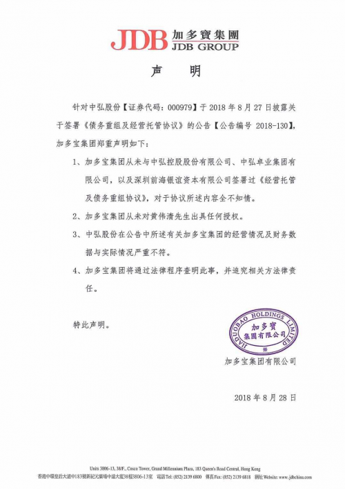 1.加多宝集团从未与中弘股份、中弘卓业集团有限公司、以及深圳前海银谊资本有限公司签署过《经营托管及债务重组协议》,对协议所述内容完全不知情。