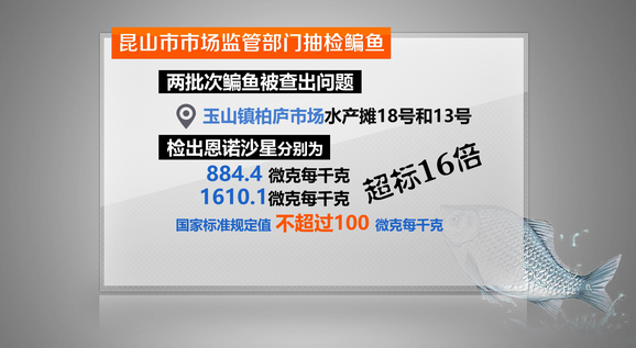 经过检测,四份鳊鱼的样本中,三份鳊鱼被测出含有抗生素恩诺沙星,但都在标准范围内。可是,就在几天前,昆山市市场监管部门抽检鳊鱼时,两批次鳊鱼被查出问题,不合格鳊鱼来自玉山镇柏庐市场,检出恩诺沙星分别为884.4微克每千克和1610.1微克每千克,而国家标准规定值不超过100微克每千克,问题鳊鱼体内,恩诺沙星足足超标16倍。