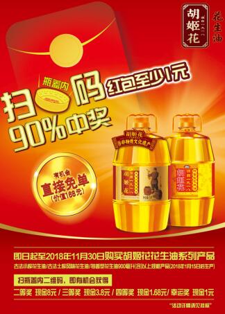即日起,胡姬花更有“扫码赢红包”活动,开盖扫码,百分百中奖赢现金红包,与胡姬花一起传承千年鲁菜风味。