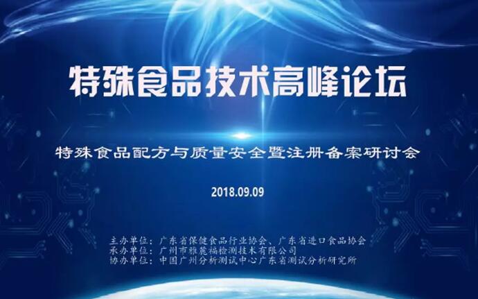 2018年9月9日,由广东省保健食品行业协会、广东省进口食品协会为主办单位,广州市雅麓福检测技术有限公司为承办单位,中国广州分析测试中心广东省测试分析研究所为协办单位联合举办的特殊食品技术高峰论坛——特殊食品配方与质量安全暨注册备案研讨会,在中国进出口商品交易会展览馆 A区8.1馆论坛区隆重举行。
