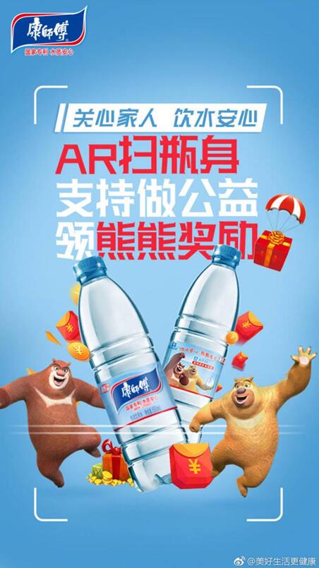 “熊熊瓶”除了借助大IP深入人心的势头,更玩转营销搭载AR助力公益!用支付宝AR扫描熊熊瓶,即可轻松赢福利做公益,参与“买2元水,支持做公益”活动。康师傅联合真爱基金,与消费者共同完成100万次集赞,为160所学校送出运动器材,为青少年健康成长助力。同时,扫描熊熊瓶,还有机会获得现金红包和优酷VIP会员以及熊熊定制表情包等礼物,在拿奖品拿到手软的同时还能培养孩子的爱心和责任感,可谓一举多得。