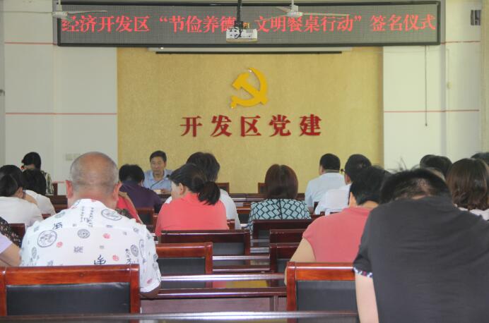 活动中,平邑经济开发区党工委班子主要领导向全体机关干部职工宣读了“节俭养德•文明餐桌行动”倡议书,号召全体职工合理就餐、科学饮食,自觉遵守餐桌礼仪,摒弃铺张浪费的不良生活习气,让“克勤于邦、克俭于家”之风在经济开发区机关中得到大力传播。随后,参加活动的近60名干部职工在“节俭养德•文明餐桌行动”倡议展板上庄严地签下了自己的名字。