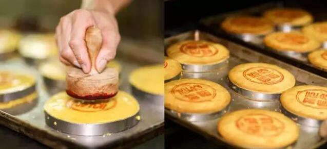 在原来的基础上做大3公分看似容易,实际困难。做过糕点的人都知道,饼是越大越难做,但做得越大就越好吃。把月饼做大最关键的工艺是制皮,饼皮的口感不仅决定月饼的整体味道,还决定了月饼的尺寸大小。师傅要用50℃温水和面,手心揉捏20次,再按压均匀,借助饼皮与手心的温度,将麻薯、鸭蛋黄、芋泥、肉松几种馅料依次铺匀,再用阴力压实。饼皮封口之后,送入炉中烘烤。烘烤的过程半步不能离开,温度过高,饼皮容易爆,温度太低,饼皮不易熟。
