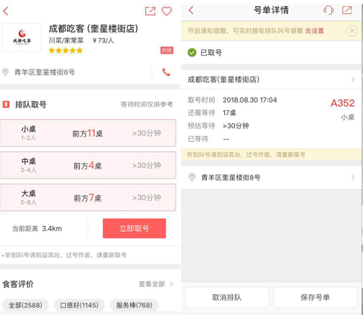 以数据来说话。今年1月,成都吃客排队人数1100多人,平均等位时长约20分钟,流失率几近六成。而在“美味·智慧餐厅”3月上线之后,排队人数因为人气爆红飙升了近两倍,达到3300多人,平均等位时长约为44分钟,但美味不用等的实时查询、到号提醒功能,将流失率降低到了34.6%,两小时内的流失率在竞争激烈的成都餐饮行业中处于低位。