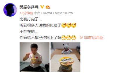 这次来到雅加达后,樊振东也遇到了饮食难题——缺少地道中国味儿的美食。在两年前的奥运会期间,乒乓球队就一起煮方便面解决在异国妒忌家乡味道的渴望。而这次在圆满完成亚运会的征程后,忍耐没有中餐多日的樊振东用一碗康师傅金汤肥牛面告慰自己的中国胃,也用这碗面作为给自己的夺冠鼓励。而在亚运会后,今年还有亚锦赛、年终巡回赛总决赛等待着他。