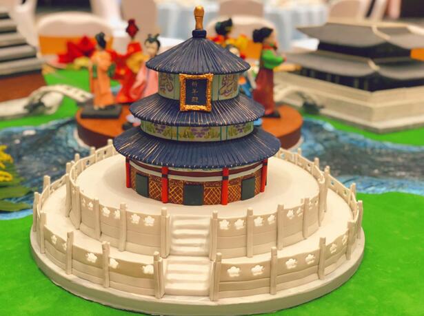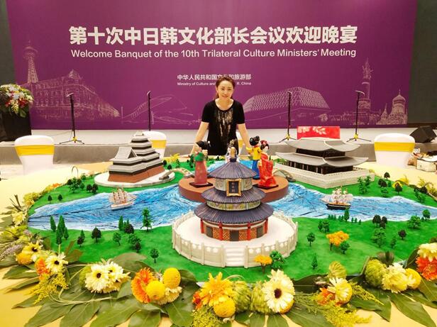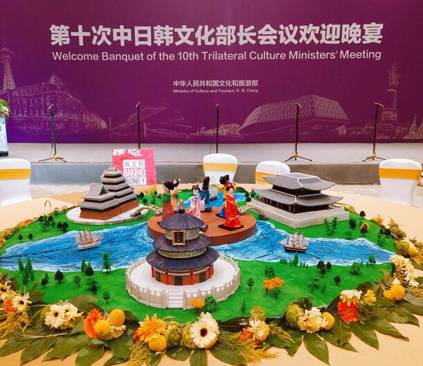 日前,第十次中日韩文化部长会议晚宴上,一个以中国天坛、韩国景福宫和日本天守阁为主造型大型翻糖蛋糕作为餐桌主体景观,引来了日韩文化部工作人员的阵阵惊呼和高度赞誉。