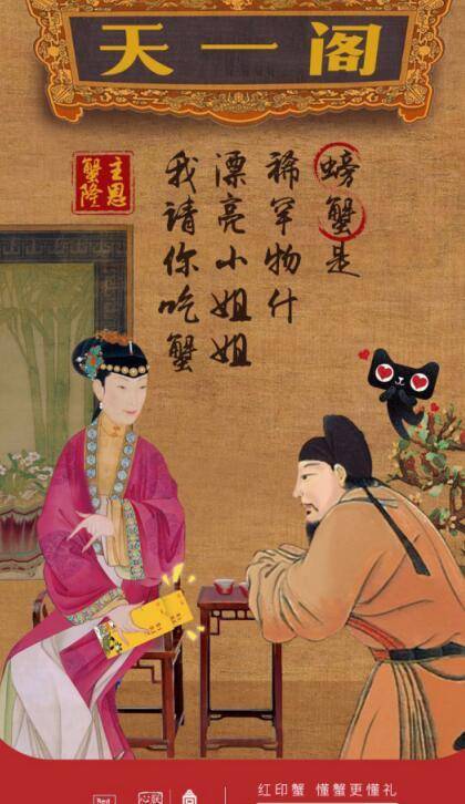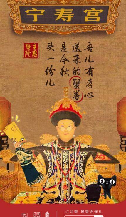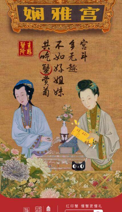 朕的心意特别版红印蟹礼盒,打造的是宫廷文化和美味兼具的“朕的好蟹”。而且通过搭配趣味的宫廷画报传播,赋予的蟹卡新的文化价值,并进一步拉近与消费者的距离。全新设计的“故宫式”的卖萌,上到太后嫔妃,下到宫女大臣,纷纷化身品蟹达人,看宫斗不如品好蟹,通过这些萌系古人传达“蟹券在手,吃蟹不愁”的信息,幽默风趣的文案更成为是吸引消费者关注的点睛之笔。