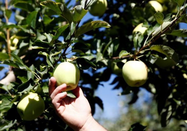 2018年9月2日,美国华盛顿州韦纳奇附近的斯塔茨曼农场,果农弗洛伊德·斯塔茨曼检查树上即将成熟的金冠苹果。(路透社)